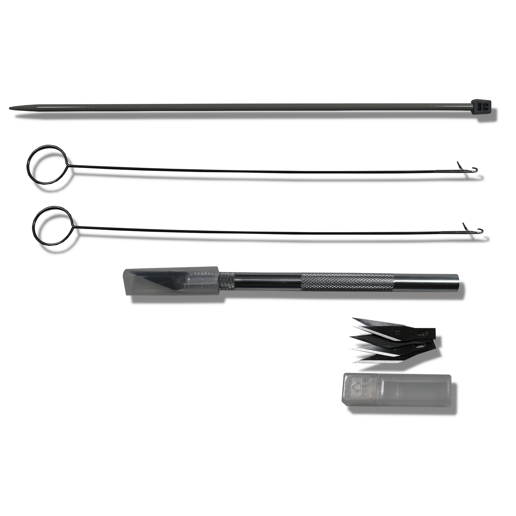 - ✔️ Hobby Knife (4.5") with 6 carbon steel blades – for proper tapers and prep